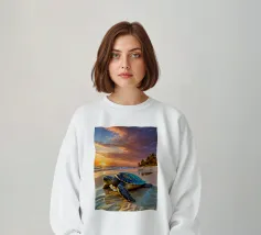 Due tartarughe strisciano sulla sabbia soffice verso l'oceano, circondate da fiori colorati in una luminosa giornata di sole. Le dolci onde sono visibili sullo sfondo.