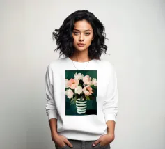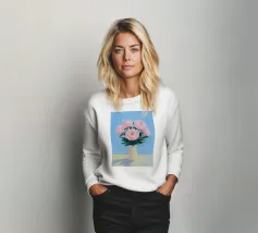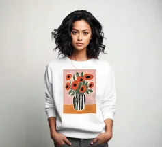 Questa illustrazione minimalista mostra un'elegante tazza di ceramica a righe bianche e nere, circondata da fiori rosa e foglie verdi. Sullo sfondo beige, l'allegro bouquet di fiori irradia leggerezza estiva e porta la freschezza botanica in ogni stanza!