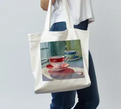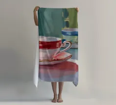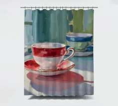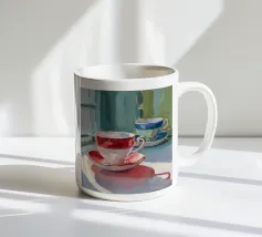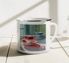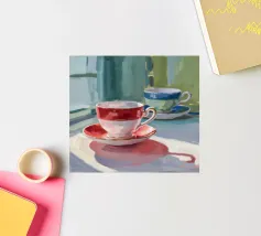 Una tazza da tè a righe rosse cattura la luce del mattino vicino alla finestra, con un'altra tazza sullo sfondo.