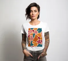 Un motivo astratto moderno ed elegante, caratterizzato da forme fluide e organiche in una calda tavolozza di terracotta, arancio, rosa e blu. La composizione è equilibrata e ha un'atmosfera sofisticata e giocosa.