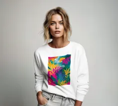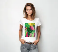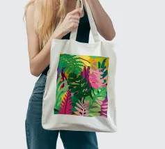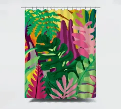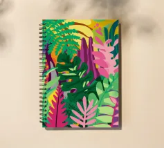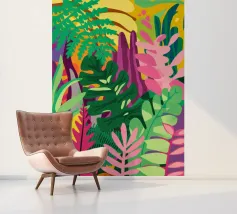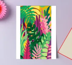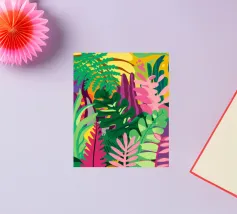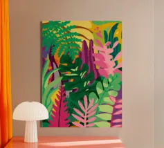 Un fogliame verde e rosa domina questa serena opera d'arte, creando una scena botanica densa e tranquilla. Le foglie sovrapposte e le texture variegate evocano la tranquilla sensazione di essere avvolti da un baldacchino della giungla vibrante e rigoglioso.