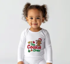 Un allegro disegno a tema natalizio presenta un omino di pan di zenzero con un cappello da Babbo Natale, circondato da icone festive come bastoncini di zucchero, alberi di Natale e campanelle. Il testo in grassetto "The Cookie Crew" cattura il giocoso spirito natalizio.