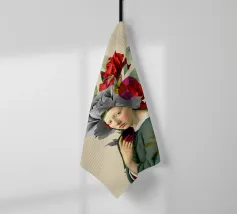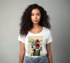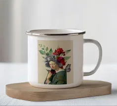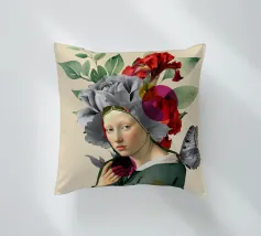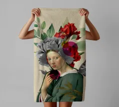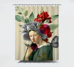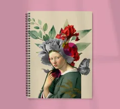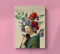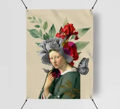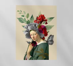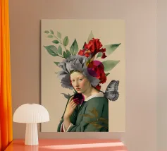 Un accattivante poster surrealista che fonde la ritrattistica rinascimentale con la moderna arte del collage. La serena figura femminile in una veste verde è adornata da fiori sbocciati, fogliame rigoglioso e forme astratte. Una farfalla in bianco e nero si posa delicatamente sulla sua spalla, aggiungendo un tocco onirico. Perfetto per gli amanti delle belle arti, del surrealismo e dell'estetica botanica.