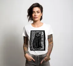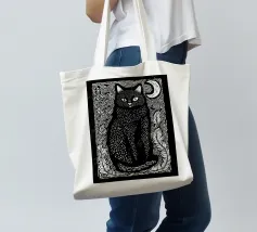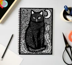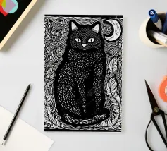 Un mistico gatto nero siede sotto una luna crescente, circondato da motivi vorticosi e trame intricate. L'opera d'arte in stile linoleografico evoca un'aria di mistero e magia, fondendo la natura e la notte in una composizione accattivante.