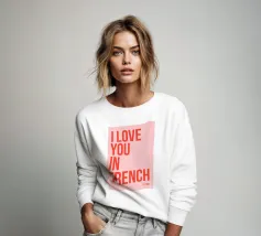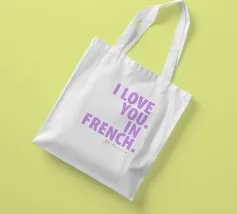 L'immagine mostra la frase "I LOVE YOU. IN FRANCESE" in caratteri grandi e decisi di colore lilla su uno sfondo beige chiaro. Sotto, le parole "Je t'aime" in un elegante carattere corsivo rosso più piccolo. La combinazione di testo in grassetto e corsivo crea un contrasto visivamente accattivante.