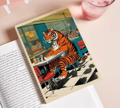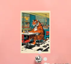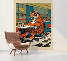 Una tigre siede tranquillamente in un diner americano - forte, surreale e affascinante allo stesso tempo. Il motivo gioca con i contrasti tra natura selvaggia e vita quotidiana, retrò e moderno. I colori ricchi, il fascino degli anni '60 e il sottile umorismo fanno di "Tiger Diner" un vero e proprio pezzo forte.