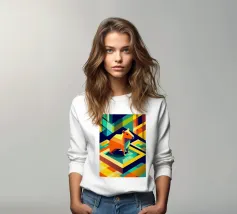 Topolino giocoso in stile geometrico che tiene in mano un grosso pezzo di formaggio. Un motivo animale affascinante e moderno con carattere - ideale per gli amanti degli animali e per idee regalo creative.