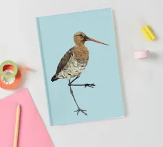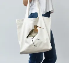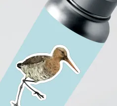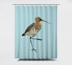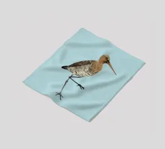 Un'illustrazione digitale ritrae una dea bendata che si regge su una zampa. L'uccello ha un lungo becco arancione, un piumaggio marrone e grigio e piume della coda nere. Le sue lunghe e sottili zampe sono grigie e una è estesa in avanti, mentre l'altra è piegata al ginocchio.