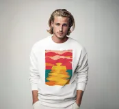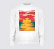 Una rappresentazione drammatica e minimalista di un tramonto sull'oceano, con un sole cremisi che si riflette sull'acqua. I colori decisi e le forme semplici creano una scena potente e suggestiva.