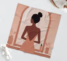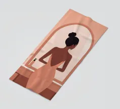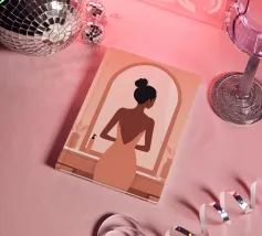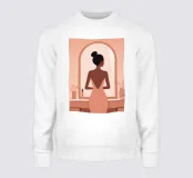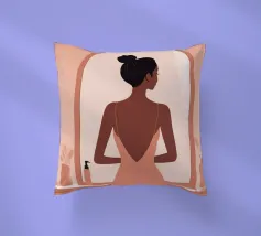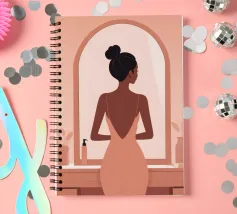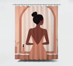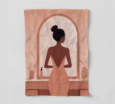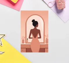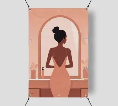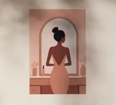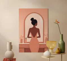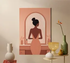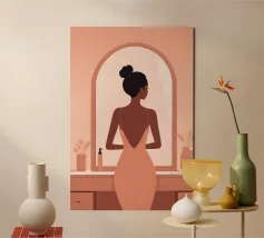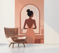 Un'opera d'arte raffinata e minimalista di una donna in abito da sera senza schienale che si trova di fronte a uno specchio illuminato in modo soffuso. I toni delicati del pesca e le forme semplici creano un senso di eleganza, amore per se stessi e bellezza interiore.