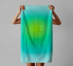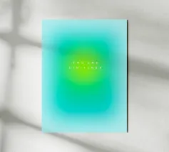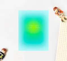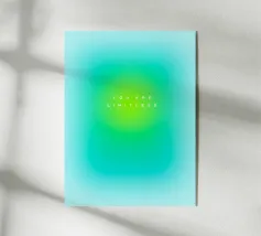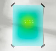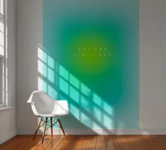 Un'opera d'arte a gradienti, rilassante e vibrante, progettata per ispirare le possibilità. YOU ARE LIMITLESS mescola il verde lime, il verde parrocchetto e il verde mare con il turchese che si fondono in un morbido sfondo color acqua pastello, creando un effetto aura che sembra fresco, arioso e silenziosamente potente.
