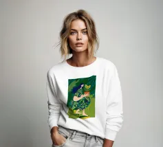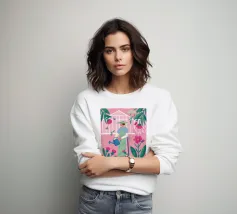 Una vivace e moderna natura morta con un tucano stilizzato, un vaso di fiori e una brocca blu. La composizione è una celebrazione audace, colorata ed eclettica della bellezza tropicale e della forma artistica.
