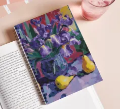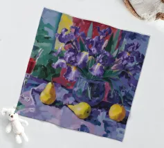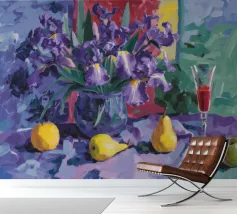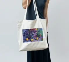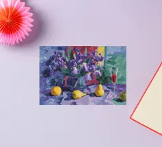 Una vivace natura morta che presenta un bouquet di tulipani viola e altri fiori complementari in un vaso, accompagnati da limoni gialli e da un oggetto rosso a contrasto, il tutto disposto su un tavolo con un panno a fantasia su uno sfondo energico e colorato.