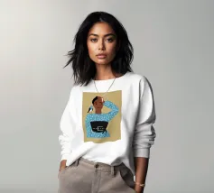 Questo dipinto raffigura una persona con un abito floreale e un uccello appollaiato sulla spalla. Lo sfondo è pieno di grandi fiori gialli e un morbido cielo viola, che creano un'atmosfera serena.