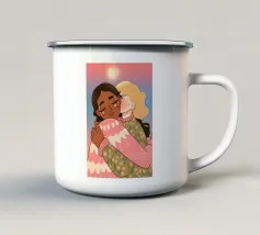 Questa opera d'arte mostra due persone che si abbracciano, con uno sfondo rosa e il simbolo di un cuore sopra di loro. I colori caldi e la posa affettuosa trasmettono un senso di amore e calore.