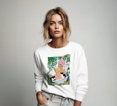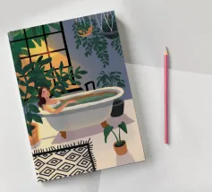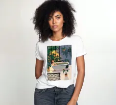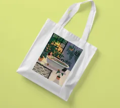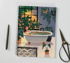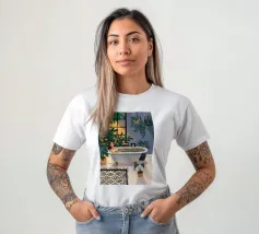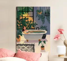 Questo dipinto mostra una persona che si rilassa in un bagno dal design accattivante, con una vasca da bagno circondata da piante verdi. La luce naturale e l'arredamento creano un'atmosfera tranquilla e lussuosa.