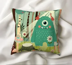Motivo: Un buffo mostro con un occhio solo in piedi in una foresta magica piena di fiori e funghi.