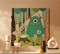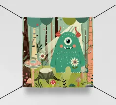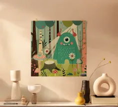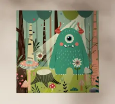 Un affascinante mostro con un occhio solo in una foresta da favola, circondato da fiori, alberi e funghi. Questo disegno irradia giocosità e fantasia - perfetto per tutti gli appassionati di natura e di mostri.Questo disegno irradia gioia, fantasia e un profondo legame con la natura.