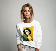 Un ritratto di grande impatto presenta una donna con un'acconciatura vivace e un trucco audace, che mette in mostra i suoi eleganti orecchini.