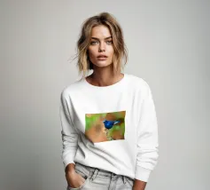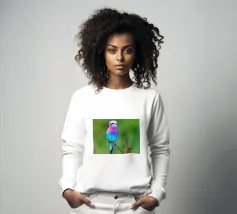 La ghiandaia azzurra siede con grazia su un ramo robusto, con le sue piume bianche e blu che contrastano con lo sfondo del fogliame verde nella luce del mattino.