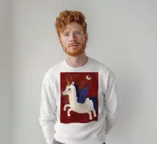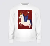 Stravagante illustrazione di un unicorno con corno dorato, ali blu stellate e luna crescente, su uno sfondo rosso intenso. Perfetto per l'arredamento dei bambini e per gli amanti del fantasy.