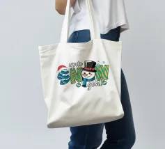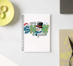 Un design giocoso a tema invernale combina elementi festivi, con un pupazzo di neve e la scritta "up to snow good" in colori vivaci. Le lettere sono decorate con motivi a righe e animali.