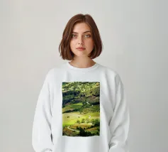 La valle è ricoperta da campi di riso di un verde intenso, che si estendono a perdita d'occhio. Le terrazze seguono le dolci curve delle colline, creando un modello armonioso di vita e crescita. Uno stretto fiume si snoda tra i campi, riflettendo il cielo blu sopra di essi. I contadini si muovono tranquillamente lungo i sentieri, curando i loro raccolti, mentre la brezza porta il fresco profumo della terra bagnata e del riso giovane. L'intera scena sembra pacifica, fertile e piena di vitalità.