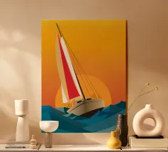 Crogiolatevi nell'energia edificante di un'opera d'arte figurativa che mostra una barca a vela che naviga in un mare in tempesta, il tutto sotto l'abbraccio di un vibrante tramonto con un grande sole giallo. Quest'opera armonizza la feroce bellezza della natura con l'ottimismo e la speranza di un nuovo inizio, diffondendo vibrazioni positive in ogni tratto.