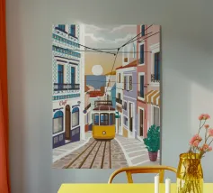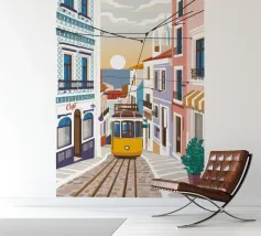 Un classico tram giallo si fa strada lungo una strada illuminata dal sole in una pittoresca città europea, probabilmente Lisbona, catturando il fascino e la bellezza dei viaggi urbani.
