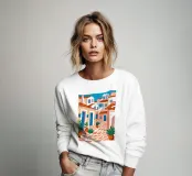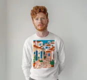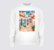 Una splendida illustrazione di un vicolo europeo baciato dal sole, con tetti in terracotta, balconi incantevoli e piante rigogliose. La luce calda e i dettagli pittoreschi creano un perfetto sogno di vacanza.