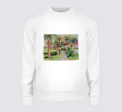 Una villa bianca e immacolata con il tetto di tegole rosse è incastonata tra palme maestose, un vialetto curvo conduce l'occhio in questo sereno e lussuoso ambiente tropicale o mediterraneo.