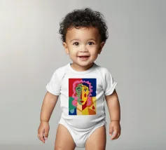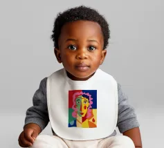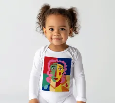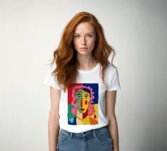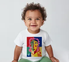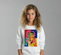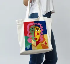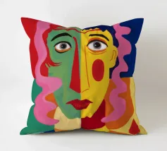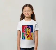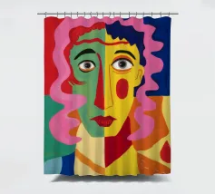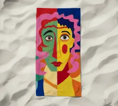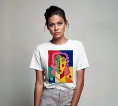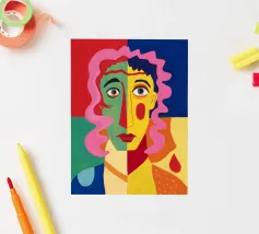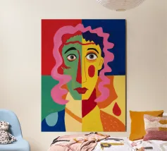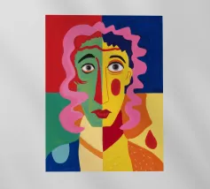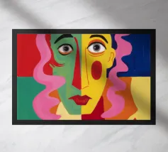 Un ritratto frammentato in stile cubista utilizza forme geometriche audaci e colori contrastanti come il rosa, il giallo, il blu e il verde per creare un volto enigmatico e stimolante.