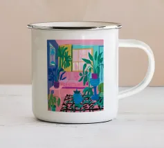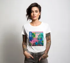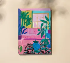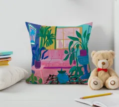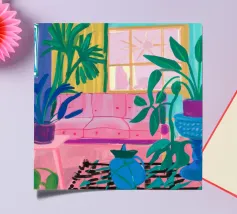 Scena d'interni di un soggiorno o di una zona pranzo, immersa in una luce viola e rosa, con piante, un tavolo apparecchiato e una finestra. Lo stile è moderno e suggestivo.