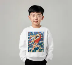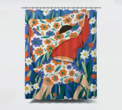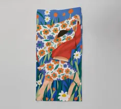 Un'affascinante illustrazione di una volpe rossa in piedi in un campo di fiori selvatici densi e colorati. Lo stile è giocoso e ha una qualità da arte popolare.
