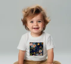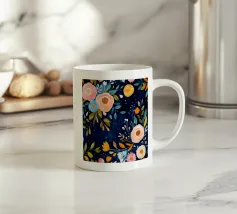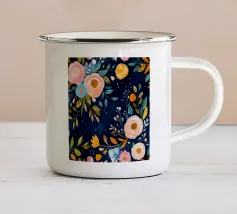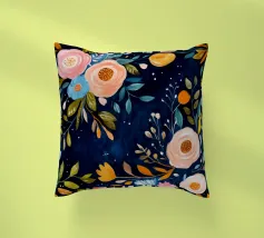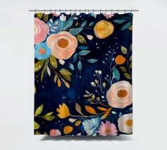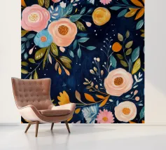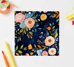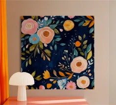 Questa opera d'arte floreale presenta un ricco sfondo acrilico blu scuro, che crea un contrasto sorprendente con i fiori e i rami in stile naif dipinti a mano che incorniciano la composizione. I fiori, nei toni tenui del blush e nelle tonalità calde, sono astratti e di una semplicità affascinante, che evoca un senso di innocenza e capriccio. Le pennellate delicate e la tavolozza calda conferiscono un'atmosfera accogliente e invitante, mentre lo sfondo blu scuro aggiunge profondità e raffinatezza. Il pezzo irradia un equilibrio di calore e serenità, perfetto per un'atmosfera rilassante ma visivamente coinvolgente.