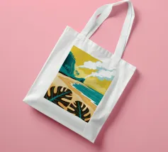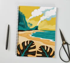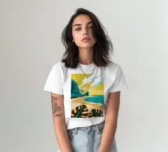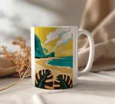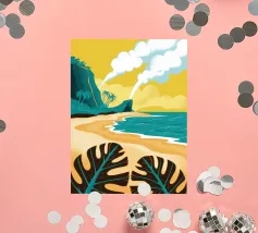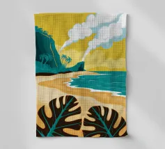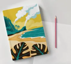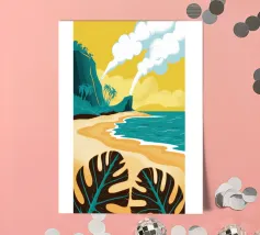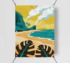 Un paesaggio stilizzato e drammatico di una spiaggia tropicale con un vulcano fumante sullo sfondo. Lo stile grafico unico e il soggetto potente creano una scena memorabile e d'impatto.
