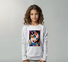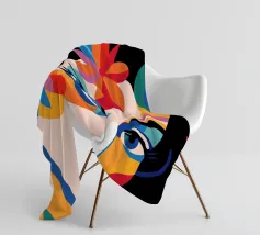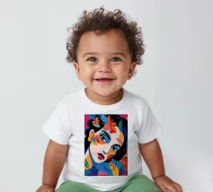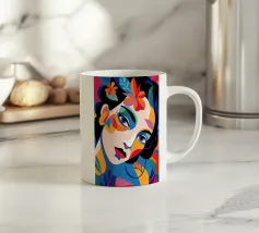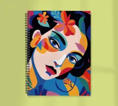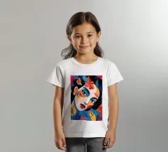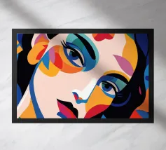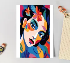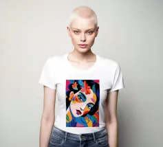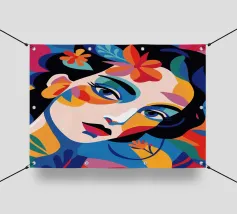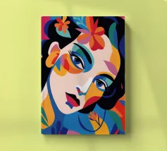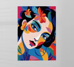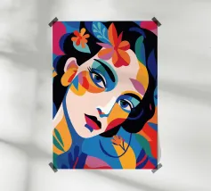 Una composizione vibrante mostra il volto di una donna adornato da elementi colorati come fiori e forme astratte. L'uso di colori audaci e contrastanti crea un senso di dinamismo e modernità.