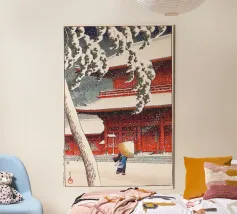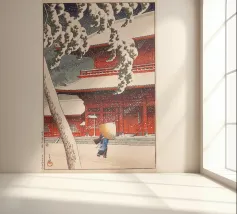 Il Tempio Zojoji a Shiba presenta una tranquilla veduta di uno dei templi più storici di Tokyo, resa con la tipica attenzione di Kawase Hasui all'atmosfera e alla luce delicata. La scena mette in risalto la graziosa architettura del tempio incorniciata da ombre morbide e dalla natura circostante, creando un'atmosfera tranquilla e riflessiva tipica dello stile shin-hanga di Hasui. Ideale per gli amanti delle stampe giapponesi su blocchi di legno, dei paesaggi storici e delle decorazioni murali serene, quest'opera d'arte conferisce profondità culturale, eleganza e bellezza senza tempo a qualsiasi interno.