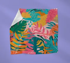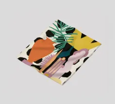 Un patchwork astratto di forme dipinte e strutturate in una tavolozza tenue di blu, ocra e beige crea una composizione sofisticata e ben bilanciata con un tocco artistico e artigianale.