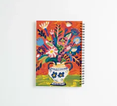 A dynamic and colorful bouquet of various abstract flowers exploding from a patterned vase against a bright red background, radiating pure joy and energy.