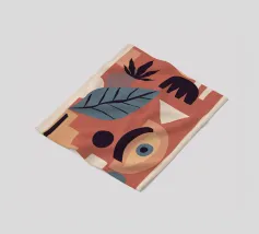 A sophisticated abstract piece with layered, semi transparent shapes in a warm palette of red, pink, and ochre, creating depth and a sense of gentle movement.