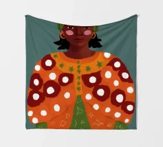This painting depicts a person with dark hair styled in two buns, wearing large orange earrings. The person's face is painted with bold red and white patterns, and the background is a solid red color.
