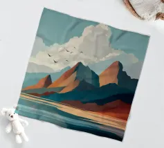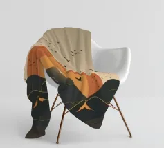 Un'illustrazione di paesaggio sereno con gabbiani che volano su un mare calmo verso il sole al tramonto, con montagne sullo sfondo, il tutto in una tavolozza di colori tenui e caldi.