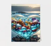 Un cuore di cristallo multicolore rivolto verso l'oceano, tra trasparenza e luce. Un cuore di cristallo trasparente, pieno di riflessi colorati, è rivolto verso l'oceano. Sotto la luce del mare, i cuoricini al suo interno catturano e diffrangono la limpidezza del cielo, creando un gioco di scintille vivaci e rilassanti. Tra purezza, movimento e armonia, quest'opera evoca la trasparenza delle emozioni e la fragile bellezza della luce sull'acqua. Una creazione luminosa, all'incrocio tra design e poesia visiva.