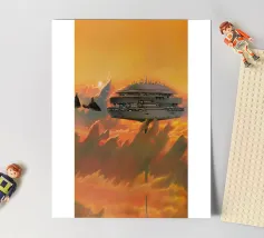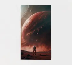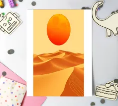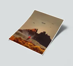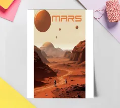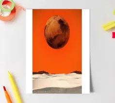 Questa illustrazione digitale cattura l'audace discesa di due coraggiosi paracadutisti su un paesaggio desertico rosso e alieno. Il terreno sottostante è una vasta e arida distesa di dune di sabbia cremisi.