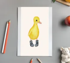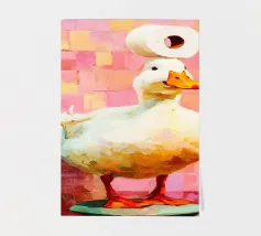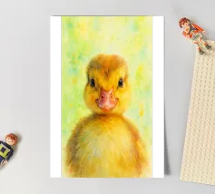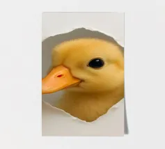 Un simpatico anatroccolo fa capolino da sotto un morbido asciugamano bianco. Le sue soffici piume gialle e i suoi occhi curiosi creano una scena adorabile e affascinante.