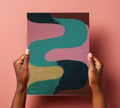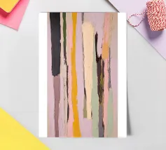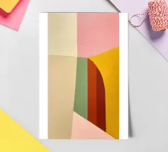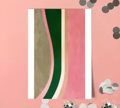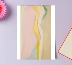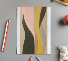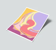 Quadro astratto con dolci curve in rosa pastello, giallo, verde, arancio, lavanda e viola su uno sfondo chiaro. I colori fluidi si combinano armoniosamente e ricordano il movimento dell'acqua. Una composizione minimalista e femminile, piena di leggerezza e dinamismo.