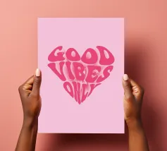 Infondete il vostro spazio di positività con questa stampa tipografica di ispirazione rétro. La frase edificante "Good Vibes Only" è riportata in caratteri retrò color pesca su un ricco sfondo verde petrolio. Questo pezzo accattivante combina il fascino vintage con un mantra moderno, perfetto per aggiungere un tocco di ottimismo a qualsiasi ambiente. Dalla zona giorno all'ufficio, questa opera d'arte rallegra l'umore e promuove un'atmosfera positiva. Lasciate che questa elegante stampa serva da promemoria quotidiano per abbracciare la buona energia e mantenere una visione ottimistica della vita.