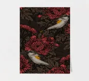Fiori di crisantemo e uccelli codirosso dipinti a mano