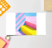 Illustrazione a guazzo di gradini gialli davanti a pareti a strisce rosa-blu-gialle. Sfondo minimalista, linee decise, forme geometriche e composizione chiara. Blocchi di colore vivaci in tonalità pastello di rosa, blu, giallo e bianco creano un'illustrazione astratta, vivace ed estetica.